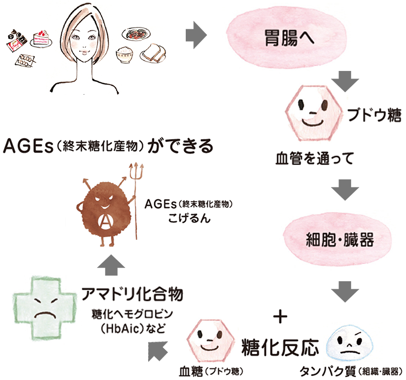 またAGEsは一生涯にわたり蓄積されますが、糖尿病疾患、腎疾患、心疾患などにより、その生成はさらに促進されてしまいます。糖化反応は、血糖値の急激な上昇の繰り返しや慢性的高血糖状態、そして、糖とタンパク質との接触時間が長いほど進行します。