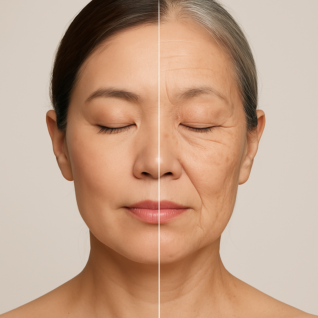 老化の現れとしての肌のくすみや弾力性の低下は、皮膚のコラーゲンタンパクの糖化反応による褐色化(=しみ・くすみ)や硬化性の変質(=シワ・たるみ)が主因です。