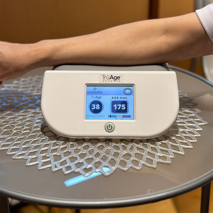 世界最新鋭の『AGEs Reader/AGEs:糖化度測定器』の上に腕を乗せるだけで、約12秒で検査は終了です!
